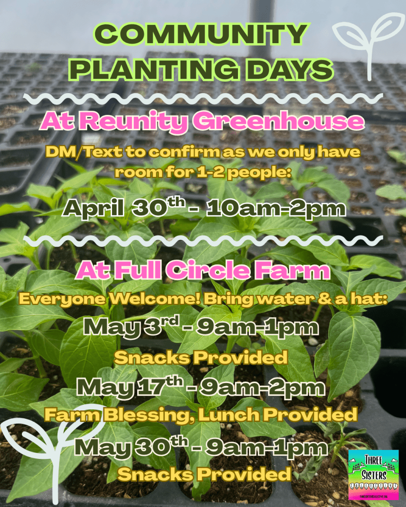 Join us for community planting days at Reunity Greenhouse and at Full Circle Farm!