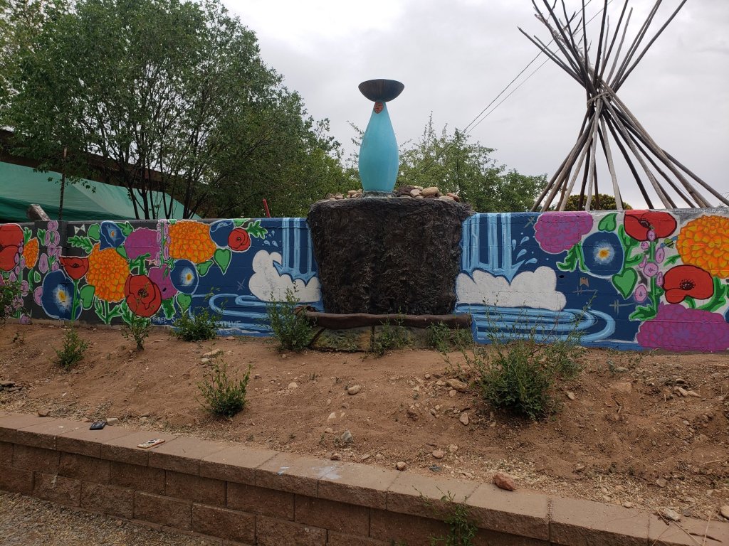 The mural will be situated in the historical Agua Fria area of O’ga P’ogeh, Santa Fe, which was originally named Ca-Tee-Ka by Tewa and Tano peoples along the Rio Grande, and this means “cold water.” There are two major Late Puebloan archaeological sites in the area, one identified as Pindi Pueblo and estimates a 3,000-3,500 BCE date for residents who dwelled in pit houses and who practiced turkey husbandry, by raising and domesticating turkeys. Pindi is a Tewa word that translates to turkey. Women were the primary turkey caregivers.