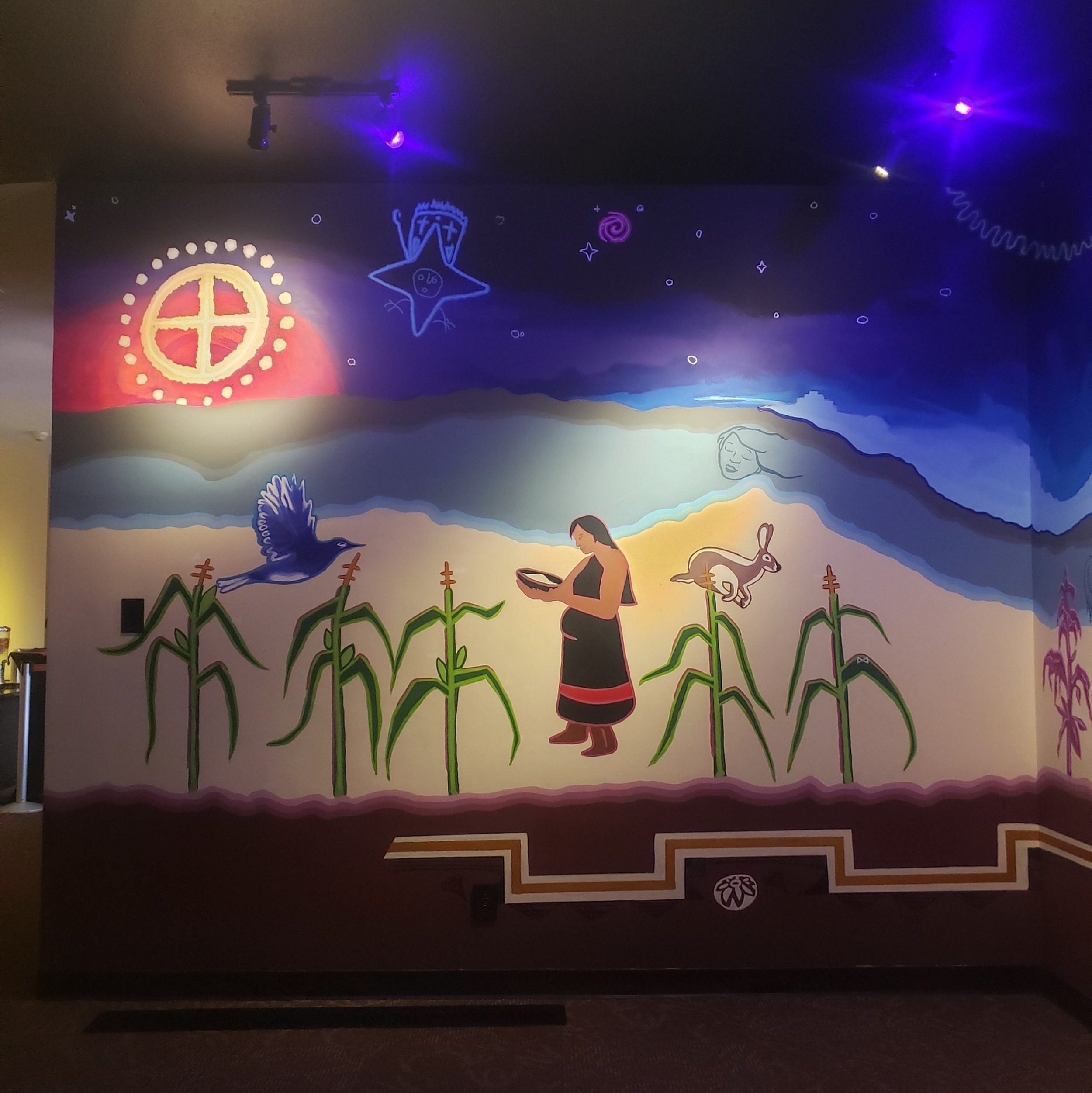We honor Corn Maiden as the storyteller at the center of this mural. Corn Mother, or Corn Maiden, is the giver of life. She is synonymous with Mother Earth and represents growth, life, creativity and the feminine aspects of the world. In traditional storyteller fashion, she carries the stories and she is the mother to the children who sit on her lap who she cradles with her knowledge.