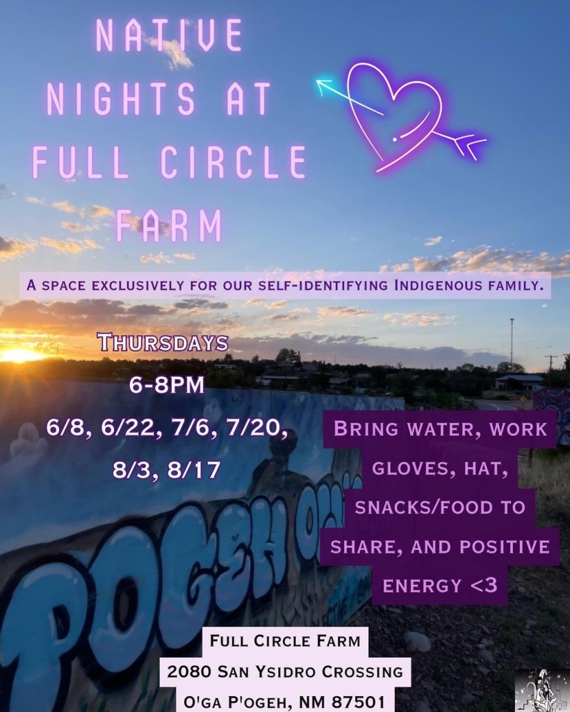 Intersectional Fridays invites our non-Indigenous community to the farm to connect with the land they inhabit in reciprocal & meaningful ways while creating a community of like minded folks who care about the future & want to learn new ways of being better land stewards & community advocates. It all starts with knowing the land you occupy! From there, comes understanding what is at stake for Indigenous people who are still actively here, doing their darnedest to maintain the integrity of our lifeways in spite of ongoing attacks on our lands and bodies. With this intent at the forefront, we invite our larger O’ga P’ogeh community to our sacred space at Full Circle Farm to work the land & engage in dialogues about what it means to be a good relative, land steward and advocate for the most vulnerable. We have a great group of folks ready to guide you through this important work so come on down, get dirty, get real and get ready to have your paradigm blown bc thats what this time is calling for. The farm is the new frontlines babes & building beloved community is what’s gonna carry us into the unknown future! Join us! Dress for work, wear a hat and bring h20! Snacks provided!